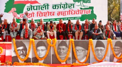 काठमाण्डु - नेपाली कांग्रेसका महामन्त्री गगन थापा र विश्वप्रकाश शर्माको आह्वानमा सुरु भएको विषेश महाधिवेशनअन्तर्गत बन्दसत्र सोमबार सुरु हुँदै छ । काठमाडौंको भृकुटीमण्डपमा आएतबार विषेश महाधिवेशनको उद्घाटन भएको थियो । महाधिवेशन प्रचार प्रसार समिति संयोजक सुभास पोखरेलका अनुसार भृकुटिमण्डपस्थित हलमा बिहान १० बजेदेखि बन्दसत्र सुरु हुने छ । बन्दसत्रको अध्यक्षता भने पार्टीको ज्येष्ठ सदस्यले गर्ने…