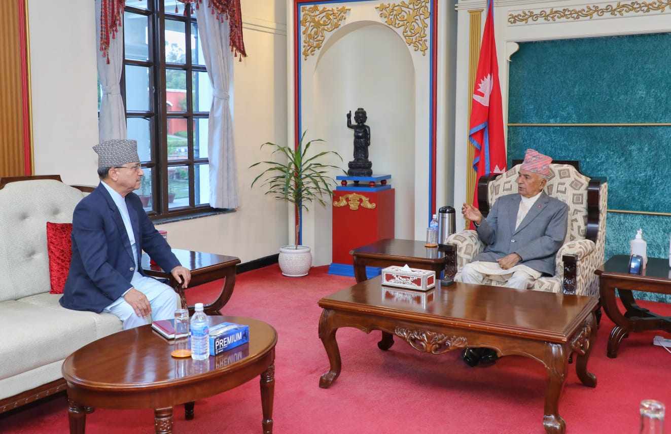 काठमाण्डु- राष्ट्रपति रामचन्द्र पौडेल र उपप्रधान तथा रक्षामन्त्री पूर्णबहादुर खड्काबीच भेटवार्ता भएको छ। सोमबार उपप्रधान तथा रक्षामन्त्री खड्काले शीतल निवास पुगेर राष्ट्रपति पौडेलसँग भेट गरेका हुन्। भेटमा खड्काले राष्ट्रपति पौडेलसँग देशको शान्ति सुरक्षा लगायतका विषयमा छलफल गरेको बताइएको छ।