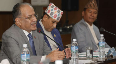 काठमाण्डु– प्रधानमन्त्री केपी शर्मा ओलीको उपस्थितिमा गत आर्थिक वर्षको प्रगति समीक्षा, चालु आर्थिक वर्षका बजेट र कार्यक्रम कार्यन्वयन योजनाका साथै वर्तमान सरकारको १०० दिनभित्र गरिने मुख्य मुख्य कामबारे आज छलफल भएको छ । प्रधानमन्त्री तथा मन्त्रिपरिषद्को कार्यालय, सिंहदरबारमा भएको छलफलमा उपप्रधानमन्त्रीद्वय, मन्त्रीहरु, प्रधानमन्त्रीका मुख्य सल्लाहकार, राष्ट्रिय योजना आयोगका उपाध्यक्ष, मुख्यसचिव र सबै मन्त्रालयका सचिवहरुको सहभागिता…