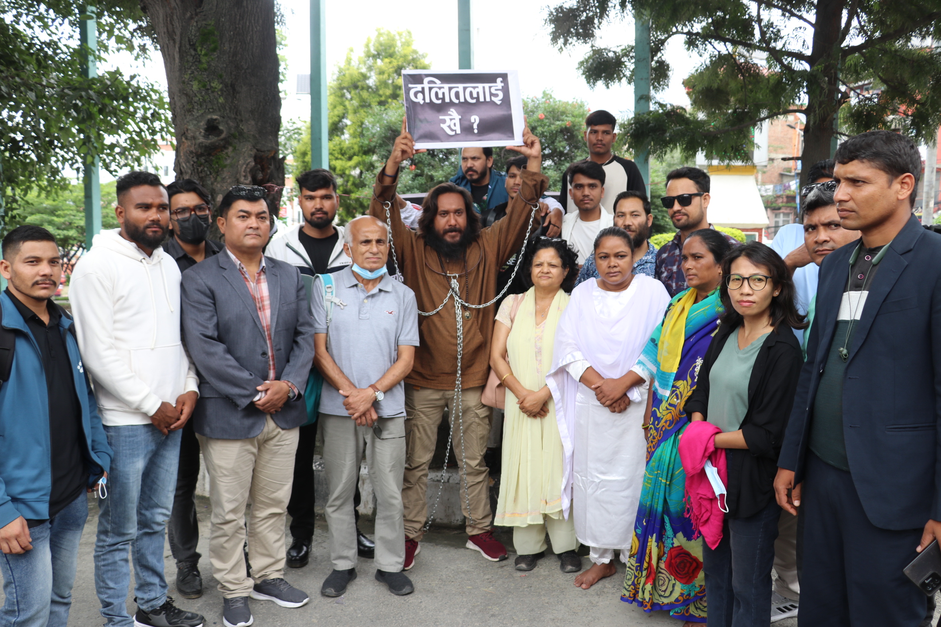 काठमाण्डु – सरकार निर्माण तथा राजनीतिक नियुक्तिमा दलित समुदायको समानुपातिक समावेशी प्रतिनिधित्वको माग गर्दै शनिबार माइतीघर मण्डलामा प्रदर्शन गरिएको छ । दलितका लागि दलित अभियान नेपालले माइतीघर मण्डलामा आयोजना गरेको प्रदर्शनमा सहभागीहरूले राज्यका हरेक निकायमा प्रतिनिधित्वको माग गर्दै प्रदर्शन गरेका थिए । प्रदर्शनमा सहभागीले फलामे साङ्लो (जन्जिर) मा बाँधिएर दलितलाई मन्त्री खै ? दलितलाई कानून…