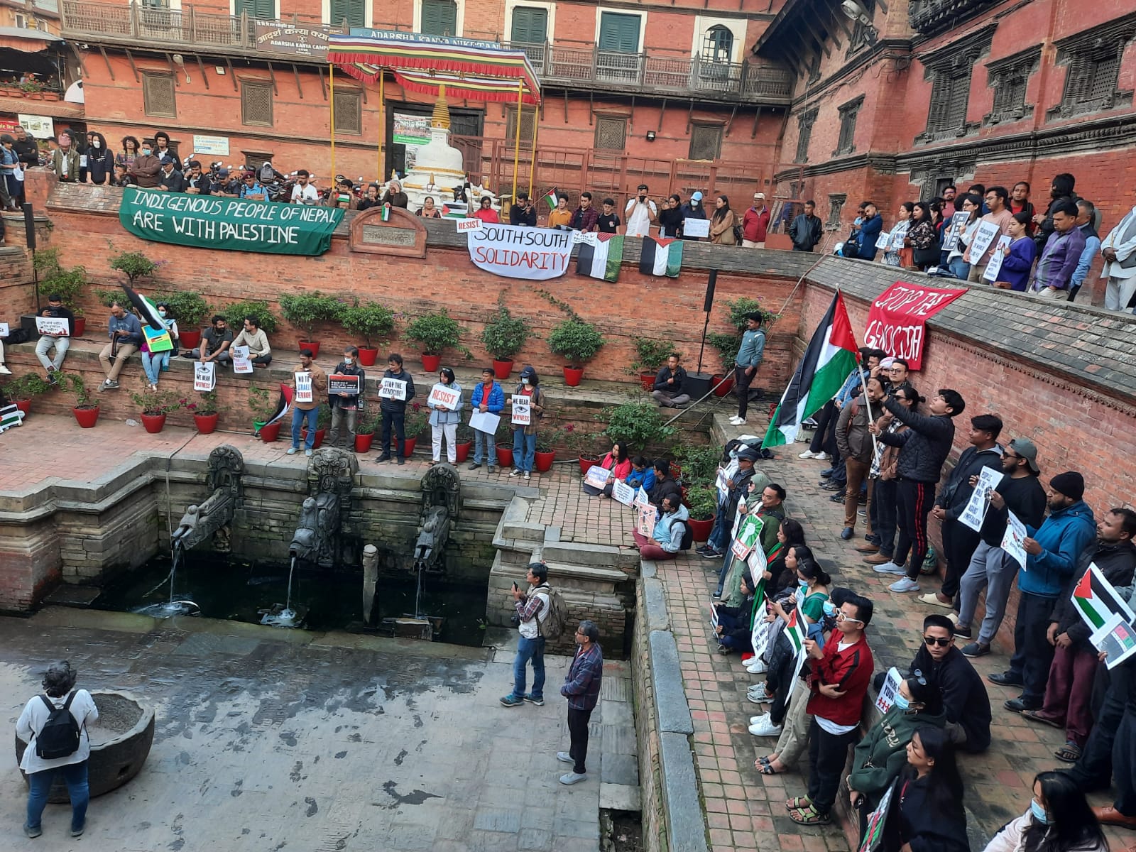 काठमाण्डु – हमासको आक्रमणपछि इजरायलले लगातार प्यालेस्टाइनमाथि गरिरहेको आक्रमणको विरोधमा बहृत् नागरिक आन्दोलनले प्रदर्शन गरेको छ । ललितपुरको पाटन दरबार सक्वायर क्षेत्रमा मंगलबार गरिएको प्रदर्शनमा प्यालेस्टिनी जनताप्रति ऐक्यबद्धता जनाइएको छ । इजरायलले युद्धविराम गरेर छलफलबाट निकास निकाल्नुपर्ने प्रदर्शनकारीको माग छ । प्रदर्शनकारीले नदीदेखि समुन्द्र प्यालेस्टाइन स्वतन्त्र, प्यालेस्टाइनको साथ छौं, भूमि खोस्न पाइँदैन, देश हत्याउन पाइँदैन,…