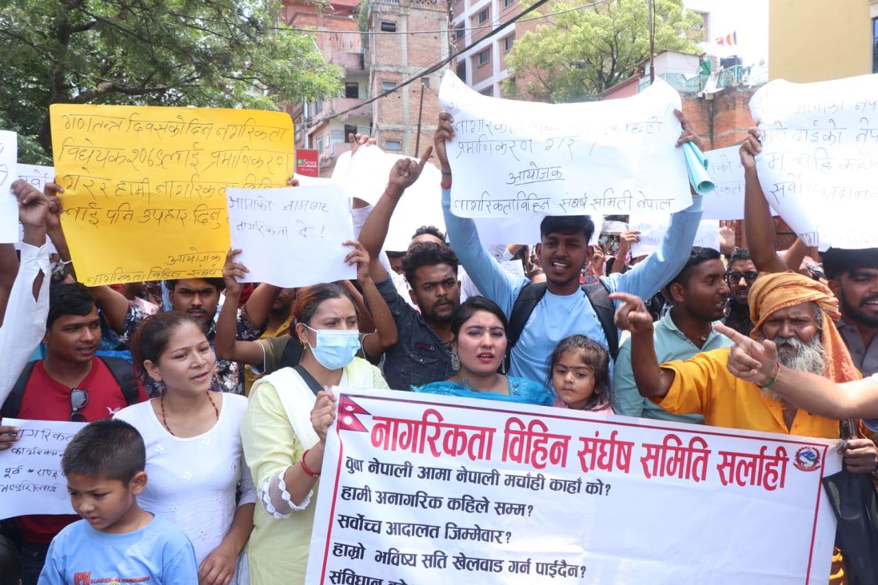 काठमाण्डु- राष्ट्रपतिबाट प्रमाणीकरण भएको नेपालको नागरिकता (पहिलो संशोधन) विधेयक २०७९ कार्यान्वयनको माग गरेर प्रदर्शन भएको छ । काठमाण्डुको माइतीघर मण्डलामा नागरिकताविहीन संघर्ष समितिको नेतृत्वमा प्रदर्शन भएको हो । नागरिकता सम्बन्धी प्रावधान समेटिएको संविधान कार्यान्वयन गर्न पनि माग गरिएको छ ।