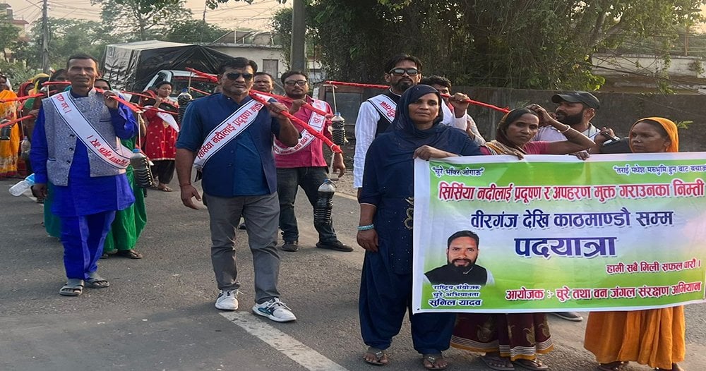 काठमाण्डु- पर्साको सिर्सिया नदीलाई प्रदूषणमुक्त बनाउन चुरे तथा वनजङ्गल संरक्षण अभियानले वीरगञ्जदेखि काठमाण्डुसम्मको पदयात्रा सुरु गरेको छ । सिर्सिया नदीलाई प्रदूषणमुक्त बनाउन सरकारलाई दबाब दिने उद्देश्यले अभियानका संयोजक सुनिल यादवको नेतृत्वमा अभियान्ता पैदलयात्रा सुरु गरेका हुन् । प्रदूषित सिर्सिया नदीको पानी बोकेर पैदलयात्रामा निस्केको अभियनता सरोजराय यादवले बताए । वीरगञ्जबाट सुरु भएको पैदलयात्रा ११ औँ…