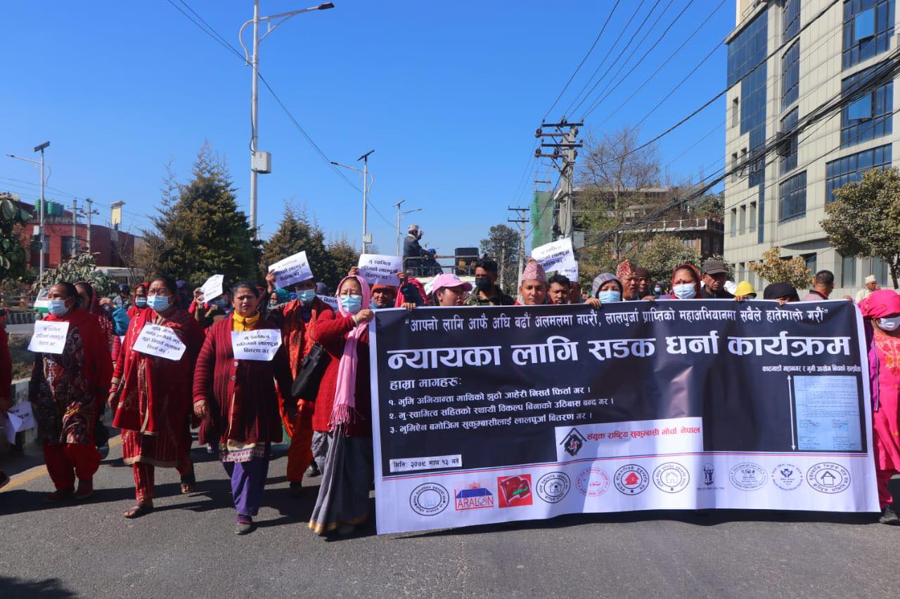 काठमाण्डु - संयुक्त राष्ट्रिय सुकुमबासी मोर्चाले काठमाडौंमा प्रदर्शन गरेको छ । काठमाडौं महानगरले बस्ती खाली गराउन खोजेपछि आन्दोलनमा उत्रिएका सुकुम्बासीले डोजर आतंक बन्द गरेर भू-स्वामित्व प्रदान गर्न माग गरेका छन् । माइतीघर मण्डलादेखि बानेश्वरसम्म प्रदर्शन गरेका गरेका उनीहरुले ‘डोजर आतंक बन्द गर, जबरजस्ती उठीबास बन्द गर, महानगरको सम्झौता कार्यन्वयन गर, काठमाडौं सुकुम्बासीको पनि हो, सुकुम्बासीमाथि…