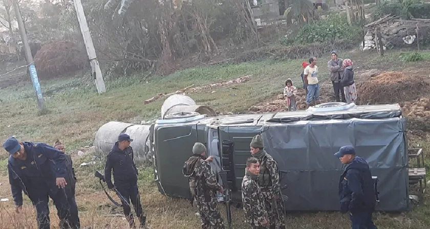 बाँके - निर्वाचन सुरक्षामा खटिएको नेपाली सेनाको पिकअप भ्यान दुर्घटना भएको छ । बाँकेको कोहलपुरमा सैनिक टोली सम्झना चोकबाट गस्ती गर्दै कोहलपुर–४ स्थित किरणमालामा पुगेपछि दुर्घटना भएकाे हाे । प्रदेश-३-०१-००२ झ ५११२ नम्बरको भ्यान निर्वाचन सुरक्षा गस्तीको क्रममा दुर्घटना भएको जिल्ला प्रहरी कार्यालय बाँकेले जनाएको छ । दुर्घटनामा मानवीय क्षति भने भएको छैन ।