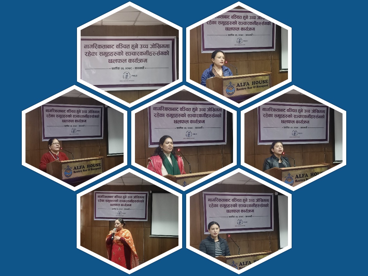 काठमाण्डु – सङ्घीय संसद्मा पेश भएको नेपाली नागरिकता ऐन, २०६३ लाई संशोधन गर्न बनेको विधेयक तत्काल पारित गरिनुपर्नेमा जोड दिइएको छ । महिला, कानून र विकास मञ्चले बुधबार आयोजना गरेको नागरिकताबाट बञ्चित हुने उच्च जोखिममा रहेका समूह र सञ्चारकर्मीसँगको छलफल कार्यक्रममा एकल महिला, सडक बालबालिका, मनोरञ्जन एवं सत्कार क्षेत्रमा कार्यरत महिला, भूमिहीनहरु नागरिकताको उच्च जोखिममा…