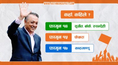 काठमाण्डु - राष्ट्रिय स्वतन्त्र पार्टी (रास्वपा)का सभापति रवि लामिछाने बुधबार सिरहाको लहानदेखि बाराको सिमरासम्म चुनावी कार्यक्रम गर्दैछन् । बुधबार बिहान लहानबाट सुरु हुने सभापति लामिछानेको कार्यक्रम साँझ सिमरामा सम्पन्न हुनेछ । उनी सिरहाको लहान र मिर्चैयाको कार्यक्रम सकेर धनुषाको ढल्केवर, जनकपुर, महोत्तरीको बर्दिवास हुँदै सर्लाही प्रवेश गर्नेछन् । सभापति लामिछानेलाई सर्लाहीमा रास्वपाका सर्लाही–४ का उम्मेदवार…