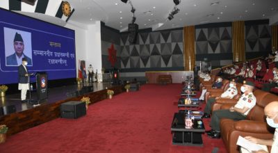 काठमाण्डु – प्रधानसेनापति प्रभुराम शर्माले नेपाली सेना जस्तोसुकै परिस्थितिमा पनि संविधानप्रदत्त जिम्मेवारी निर्वाह गर्न कटिबद्ध रहेको बताएका छन् । बिहीबार ‘प्रथम कमाण्ड सेनापति समन्वयात्मक बैठक २०७८’ को कार्यक्रममा बोल्दै प्रधानसेनापति शर्माले नेपाली सेना सरकारका विधिसम्मत आदेशहरु अक्षरसः पालना गर्न कटिबद्ध रहेको बताएका हुन् । उनले प्राप्त जिम्मेवारी पूर्णरुपमा सम्पन्न नभएसम्म नेपाली सेना कर्तव्यपथमा अडिग रहनेछ…