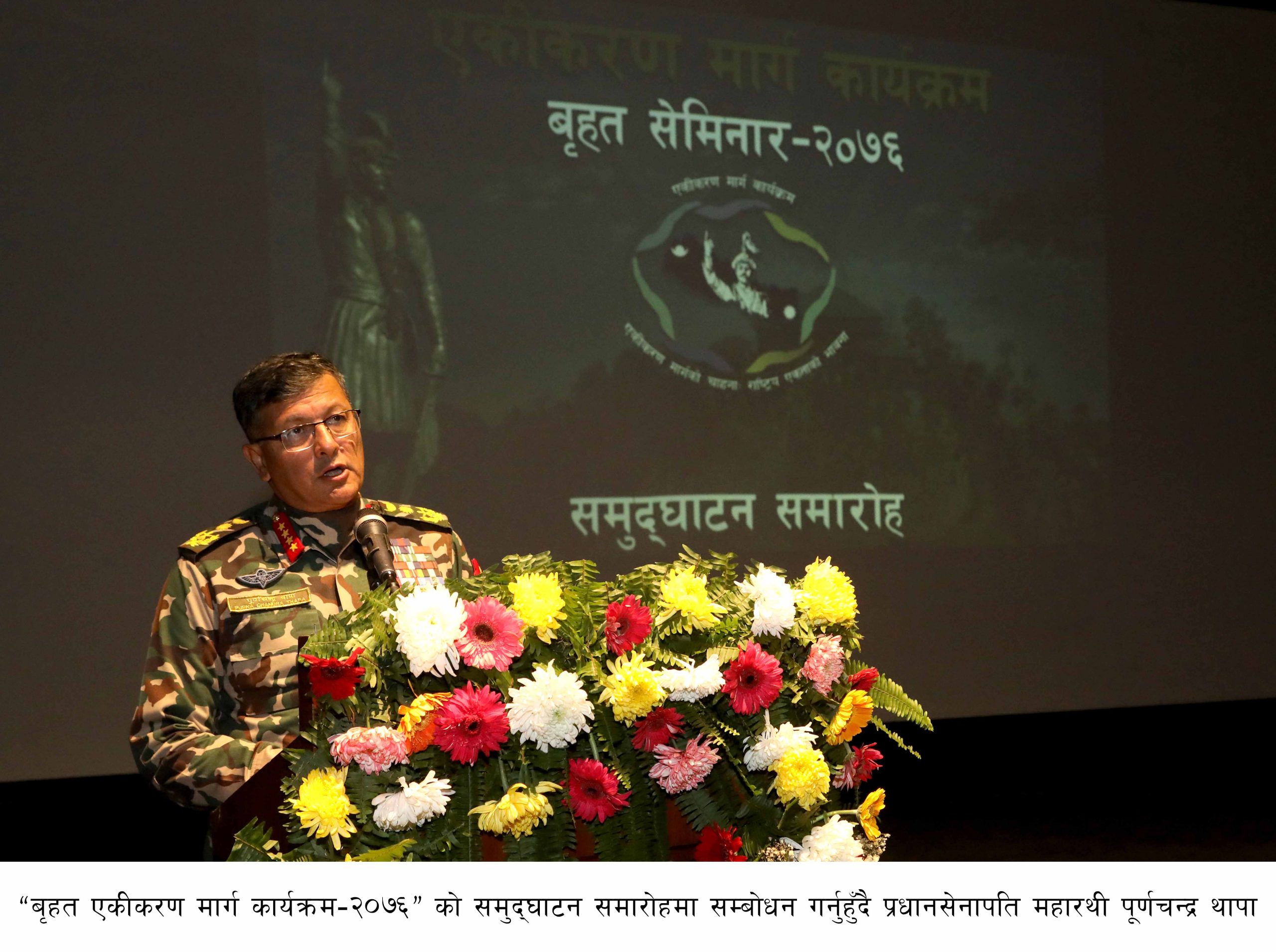 काठमाडौं - नेपाली सेनाका प्रधानसेनापति पूर्णचन्द्र थापाले राष्ट्रिय एकताको संरक्षण र सम्बर्धन गर्ने सेनाको संवैधानिक जिम्मेवारी भएको बताएका छन् । बृहत् एकीकरण मार्ग कार्यक्रमको जंगी अड्डामा बिहिवार आयोजित एक विशेष कार्यक्रमको उदघाटन गर्दै थापाले नेपाली सेनाले शुरुमा ऐतिहासिक गढी, किल्ला तथा एकिकरण पदमार्गको संरक्षण गर्ने लक्ष्यका साथ शुरु भएको कार्यक्रमलाई थप व्यवस्थित बनाउन “इतिहास संरक्षण…