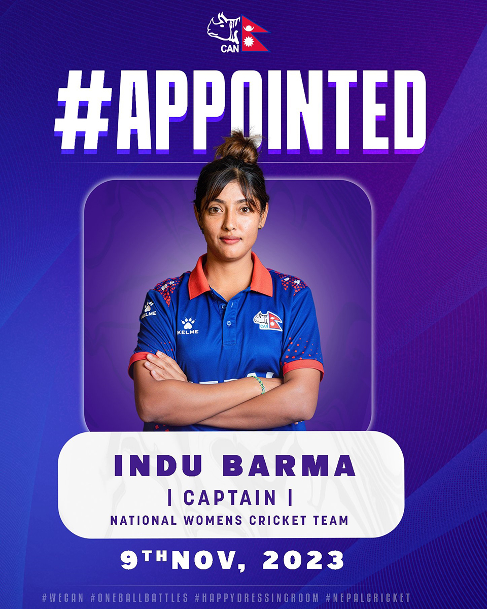काठमाण्डु – नेपाल क्रिकेट संघ (क्यान) ले राष्ट्रिय महिला क्रिकेट टोलीको कप्तानमा इन्दु बर्मालाई नियुक्त गरेको छ । आज बिहीबार क्यानले बर्मालाई कप्तान नियुक्त गरेको जनाएको छ । क्यानले नोभेम्बर १५ देखि हङकङ, चीनमा हुने ट्वान्टी–२० अन्तर्राष्ट्रिय शृंखलाका लागि बर्माको कप्तानीमा १४ सदस्यीय टोली चयन गरेको छ । टोलीमा बिन्दु रावल उपकप्तान छिन् । टोलीमा…