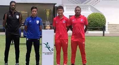 काठमाण्डु - नेपालविरुद्ध सहज जितसँगै भारतले यु १७ साफ च्याम्पियनसिपको उपाधि जितेको छ । बुधबार रोसकोर्स अन्तर्राष्ट्रिय फुटबल रंगशालामा सम्पन्न खेलमा भारतले नेपाललाई ४-० ले पराजित गर्यो । कप्तान प्रशान्त लक्ष्मण रातो कार्ड पाउँदै मैदान बाहिरिएपछि १० खेलाडीमा सीमित बन्दै खेलको अन्त्य गरेको नेपालबिरुद्द भारतले सहज जित निकाल्यो । भारतको जितमा बबी सिंह, कोरोउ सिंह,…