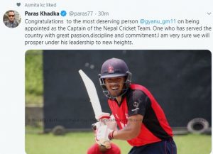 काठमाडौं – नेपाली राष्ट्रिय क्रिकेट टोलीका कप्तान ज्ञानेन्द्र मल्लले आफूलाई ठूलो उत्तरदायित्व आएको प्रतिक्रिया दिएका छन् । बुधवार नेपाली टिमको कप्तानमा चयन भएसँगै बिहीवार सामाजिक सञ्जालमार्फत् नेपाली टिमको कप्तानीसँगै आफूलाई ठूलो उत्तरदायित्व आएको प्रतिक्रिया दिएका हुन् । मल्लले लेखेका छन्, ‘नेपाली क्रिकेट टिमको कप्तान बन्न पाउनु सम्मानको विषय हो ।’ उनले पारस खड्काको कप्तानीमा नेपाली…