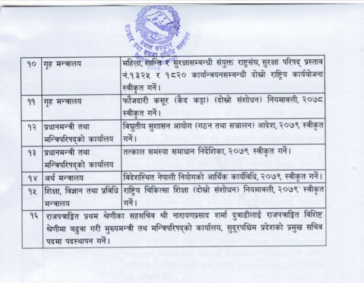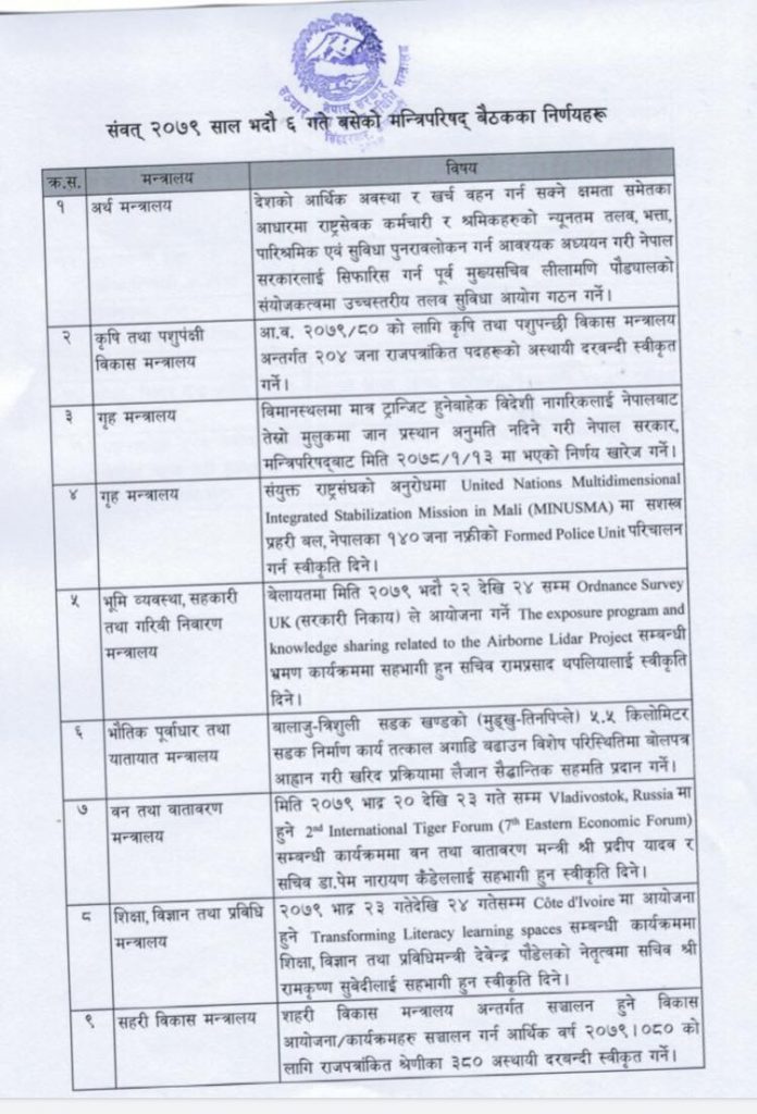 बैठकले राष्ट्रसेवक कर्मचारी र श्रमिकहरूको न्यूनतम तलबभत्ता र पारिश्रमिक पुनरावलोकन गर्न आवश्यक अध्ययन गरी सिफारिस गर्न उच्चस्तरीय तलव सुविधा आयोग गठन गरेको छ ।