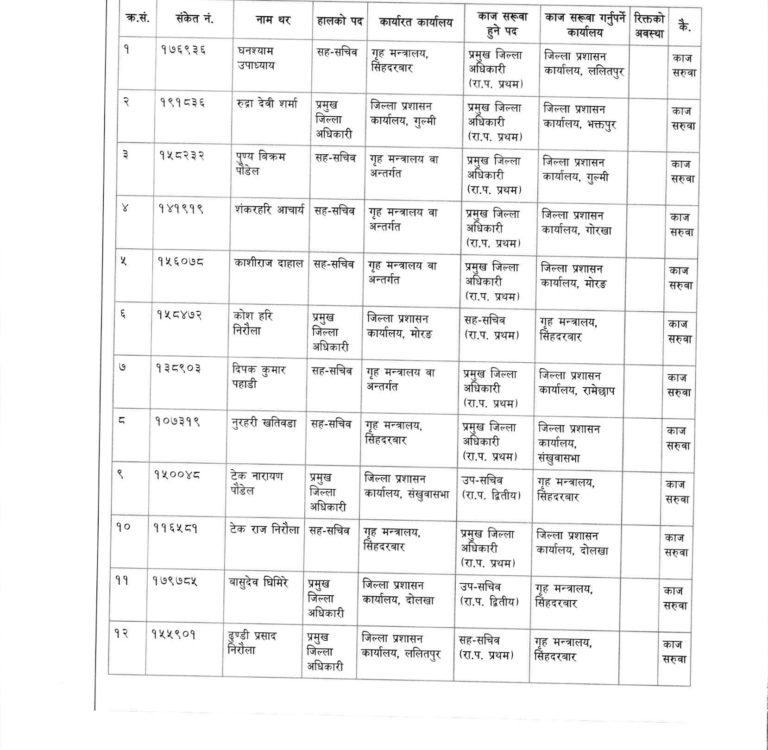 ललितपुरमा घनश्याम उपाध्याय, भक्तपुरमा रुद्रादेवी शर्मा, गुल्मीमा पुण्य विक्रम पौडेल र गोरखामा शंकरहरि आचार्यलाई सरुवा गरिएको छ ।