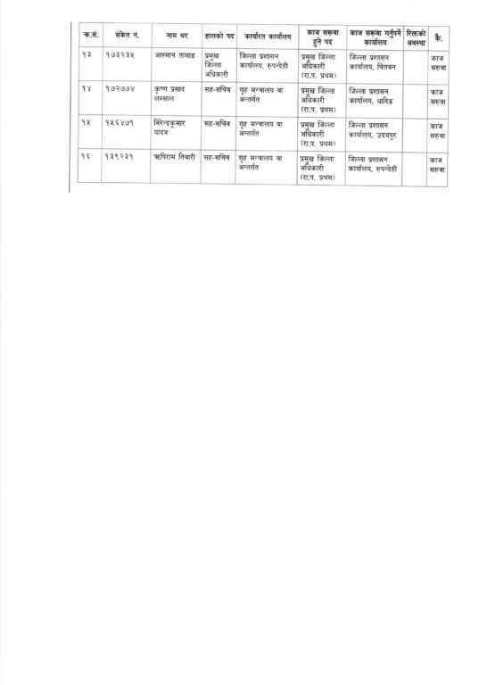 त्यस्तै, मोरङमा काशिराज दाहाल, रामेछापमा दीपककुमार पहाडी, संखुवासभामा नुरहरि खतिवडा, दोलखामा टेकराज निरौला, चितवनमा आस्मान तामाङ, धादिङमा कृष्णप्रसाद लम्साल, उदयपुरमा वीरेन्द्रकुमार यादव र रुपन्देहीमा ऋषिराम तिवारीलाई काज सरुवा गरिएको छ ।