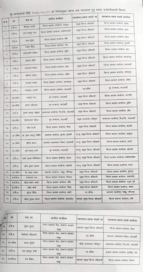 मकवानपुरका प्रजिअ आशमान तामाङ धादिङ सरुवा भएका छन् । त्यस्तै काभ्रेका प्रजिअ उदयबहादुर राना झापा सरुवा भएका छन् । मोरङमा मदन भुजेल, रुपन्देहीमा महादेव पन्थ, बारामा फडिन्द्रमणि पोखरेल, सुनसरीमा राजेश पौडेल, झापामा उदयबहादुर राणा, इलाममा सीताराम कार्की, धादिङमा आशमान तामाङ, सुर्खेतमा बसन्त अधिकारी, बाँकेमा कुमारबहादुर खड्का, कास्कीमा रमेश केसी, मुस्ताङमा वेदप्रसाद अर्याल, जाजरकोटमा जनराज पन्तको सरुवा गरिएको छ ।