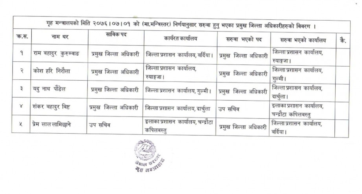 मन्त्रालयका अनुशार जिल्ला प्रशासन कार्यालय, बर्दियाका सिडियो राम बहादुर कुरुम्वाङलाई स्याङजामा सरुवा गरेको छ भने स्याङजाका कोशहरि निरौलालाई गुल्मी सरुवा गरेको छ । कुरुम्वाङको ठाउँमा इलाका प्रशासन कार्यालय चन्द्रौटा, कपिलवस्तुका उपसचिव प्रेमलाल लामिछानेलाई पठाएको छ ।