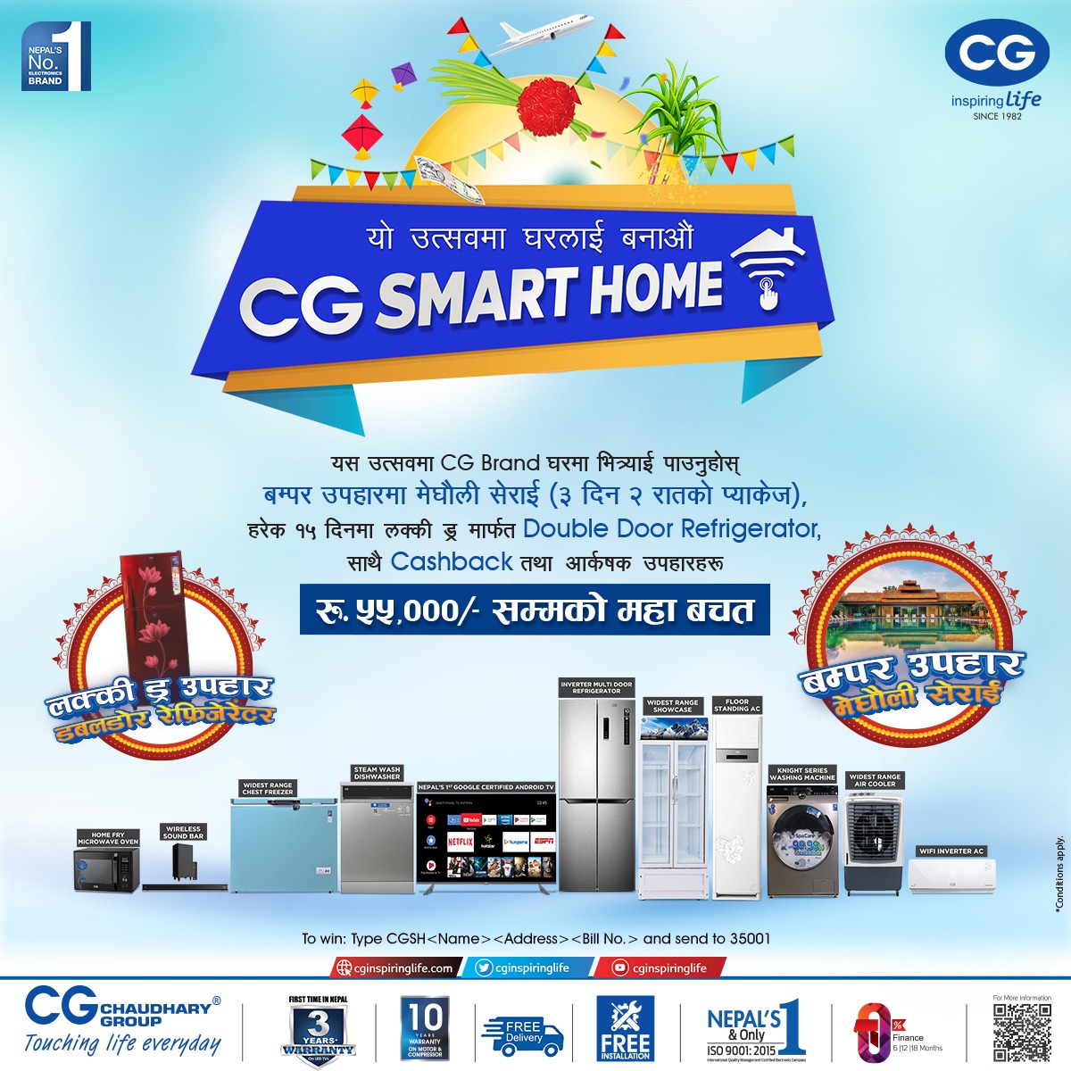काठमाण्डु – नेपालको सबै भन्दा ठूलो इलेक्ट्रोनिक्स ब्राण्ड सि.जी.ले नजिकिएको नेपालीहरुको महान चाड दशैं र तिहारलाई लक्षित गर्दै ‘यो उत्सबमा घरलाई बनाऔं सि.जी स्मार्ट होम’ नामक योजना बजारमा ल्याएको छ ।