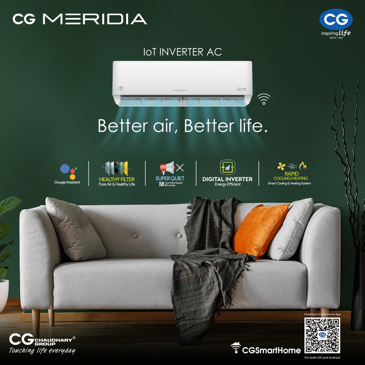 ‘डिस्ट्रिब्युटेड हेल्दी फिल्टर सिस्टम’ जडित ‘सिजी मेरिडिया’ आईओटी इन्भर्टर एसी ५६ डिग्रीको उच्च तापक्रममा आफैं सफा र निर्मलिकरण हुने विशेषता राख्दछ । डिजिटल इन्भर्टर जडान भएकाले विद्युत खपतलाई कम गर्दछ भने स्मार्ट कन्ट्रोल अन्तर्गत वाईफाई र एआई भ्वाइस कन्ट्रोल मार्फत यस एसीलाई चलाउन सकिन्छ ।
