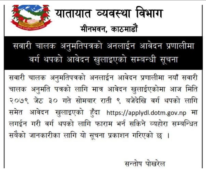 यसअघि विभागले सवारी चालक अनुमति पत्रको लागि नयाँ सवारी चालक अनुमति पत्रको लागि मात्रै आवेदन खुलाएको थियो । विभागअन्तर्गत सूचना प्रविधि शाखाका इन्जिनियर सन्तोस पोखरेलले एक सूचना जारी गर्दै वर्ग थप गर्न समेत अनलाइन आवेदन दिन सकिने जानकारी दिएका हुन् ।