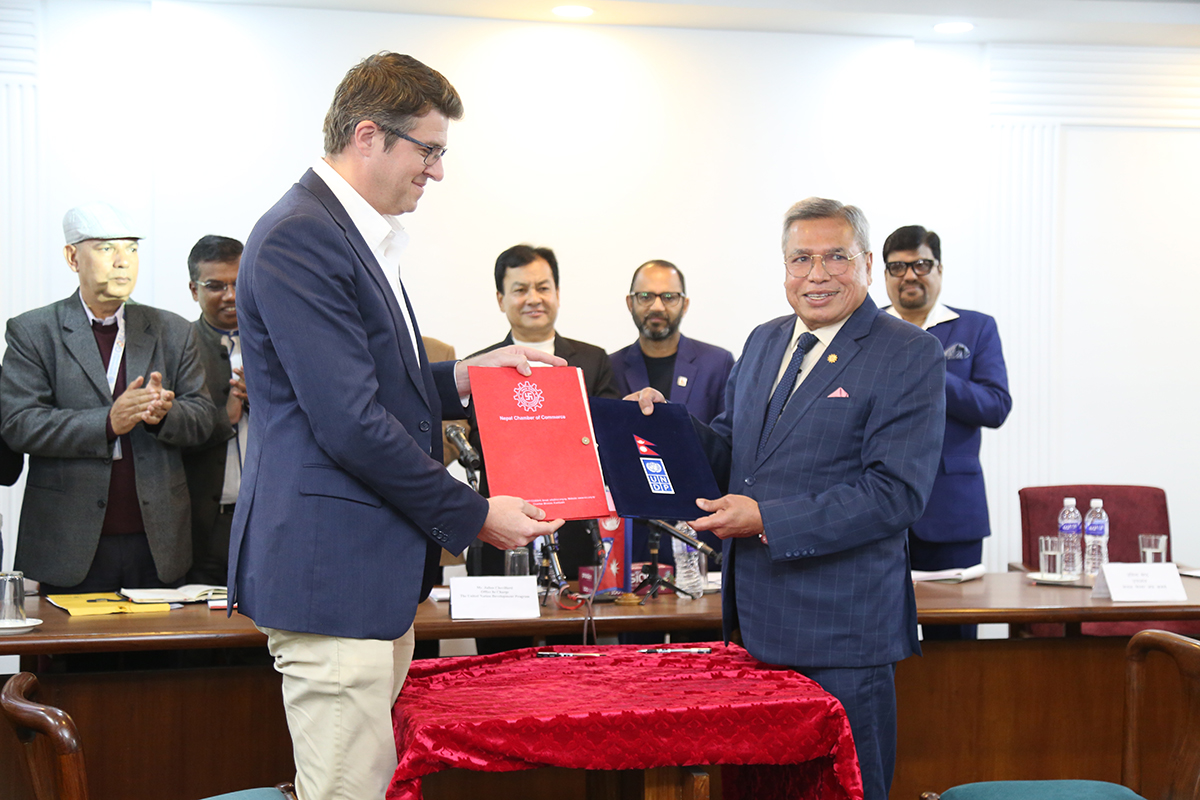 काठमाण्डुको जमलस्थित चेम्बर भवनमा सोमबार आयोजित कार्यक्रममा चेम्बर अध्यक्ष कमलेश कुमार अग्रवाल र यूएनडीपीका कार्यबाहक आवासीय प्रतिनिधि जुलिएन चेभिलार्डले हस्ताक्षर गरे ।