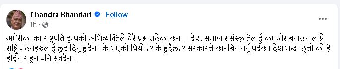 बिहीबार सामाजिक सञ्जाल फेसबुकमा स्टाटस लेख्दै नेता भण्डकारीले ट्रम्पमको अभिव्यक्तिको विषयमा सरकारले छानबिन गर्नुपर्ने बताएका हुन् । देशभन्दा ठुलो कोही नहुने र हुन पनि नसक्ने भन्दै के भएको थियो? के हुँदैछ? भनेर सरकारले गम्भीरतापूर्वक चासो लिनुपर्ने भण्डारीले बताएा छन् ।