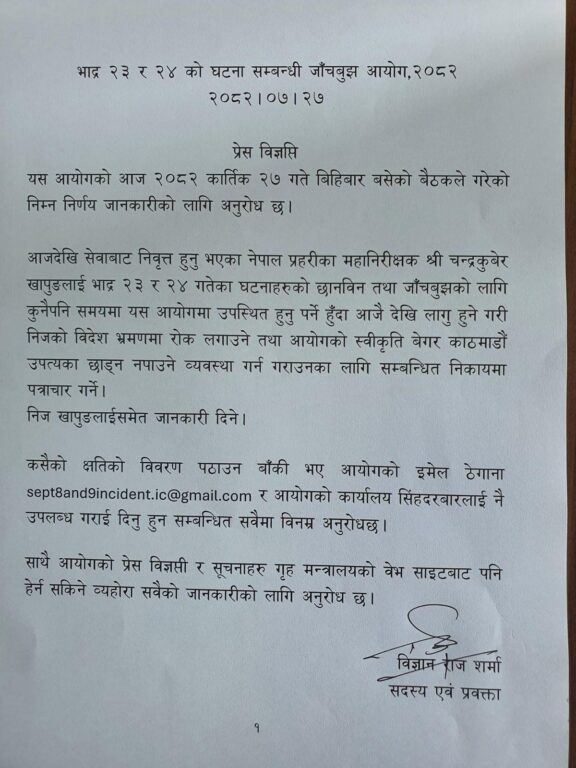‘आजदेखि सेवाबाट निवृत्त हुनु भएका नेपाल प्रहरीका महानिरीक्षक चन्द्रकुबेर खापुङलाई भाद्र २३ र २४ गतेका घटनाहरूको छानविन तथा जाँचबुझको लागि कुनैपनि समयमा यस आयोगमा उपस्थित हुनुपर्ने हुँदा आजैदेखि लागुहुने गरी निजको विदेश भ्रमणमा रोक लगाउने तथा आयोगको स्वीकृति बेगर काठमाडौं उपत्यका छाड्न नपाउने व्यवस्था गर्न गराउनका लागि सम्बन्धित निकायमा पत्राचार गर्ने,’ आयोगका सदस्य एवं प्रवक्ता पूर्व एआइजी विज्ञानराज शर्माले जारी गरेको सूचनामा उल्लेख छ ।
