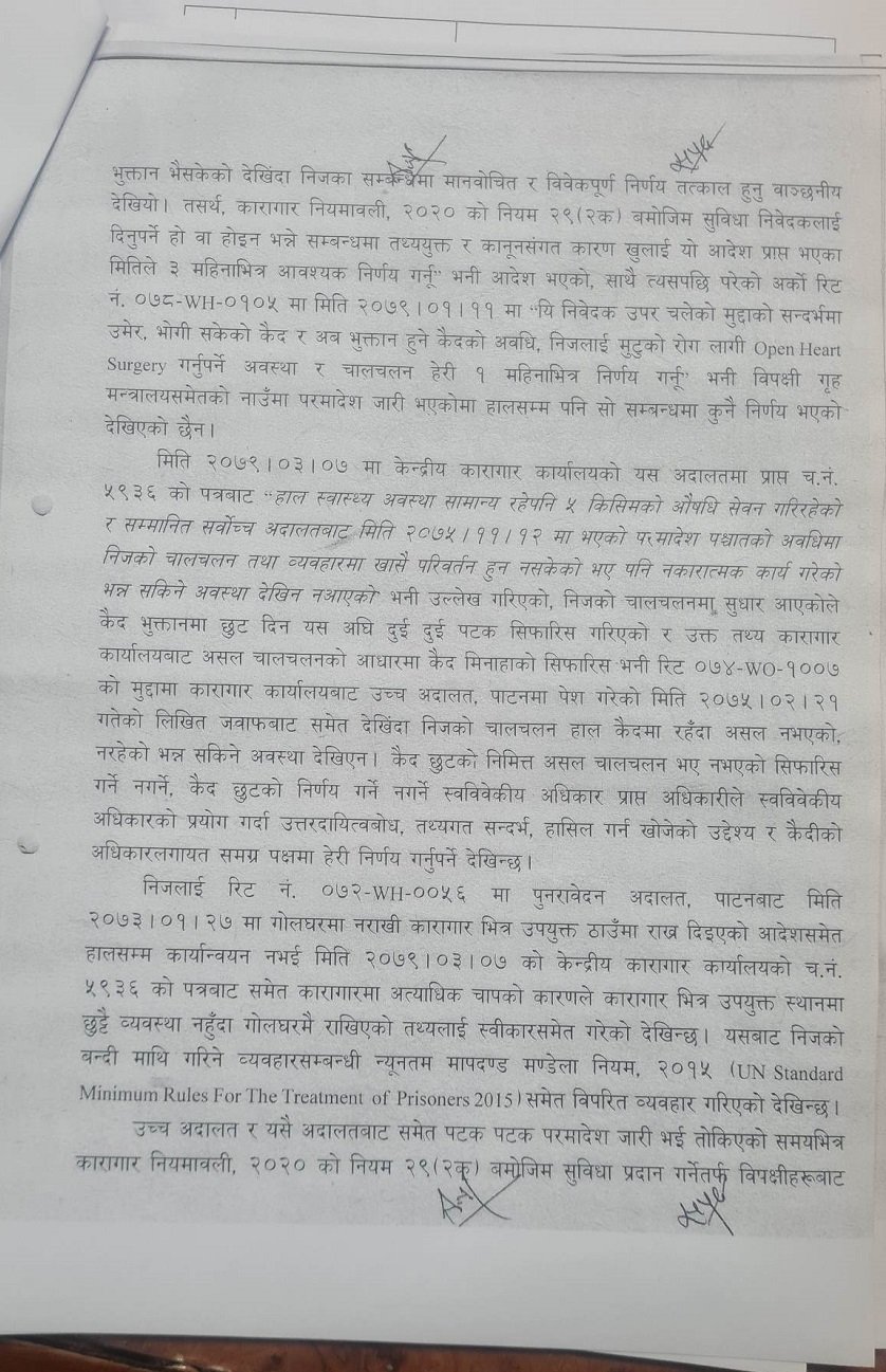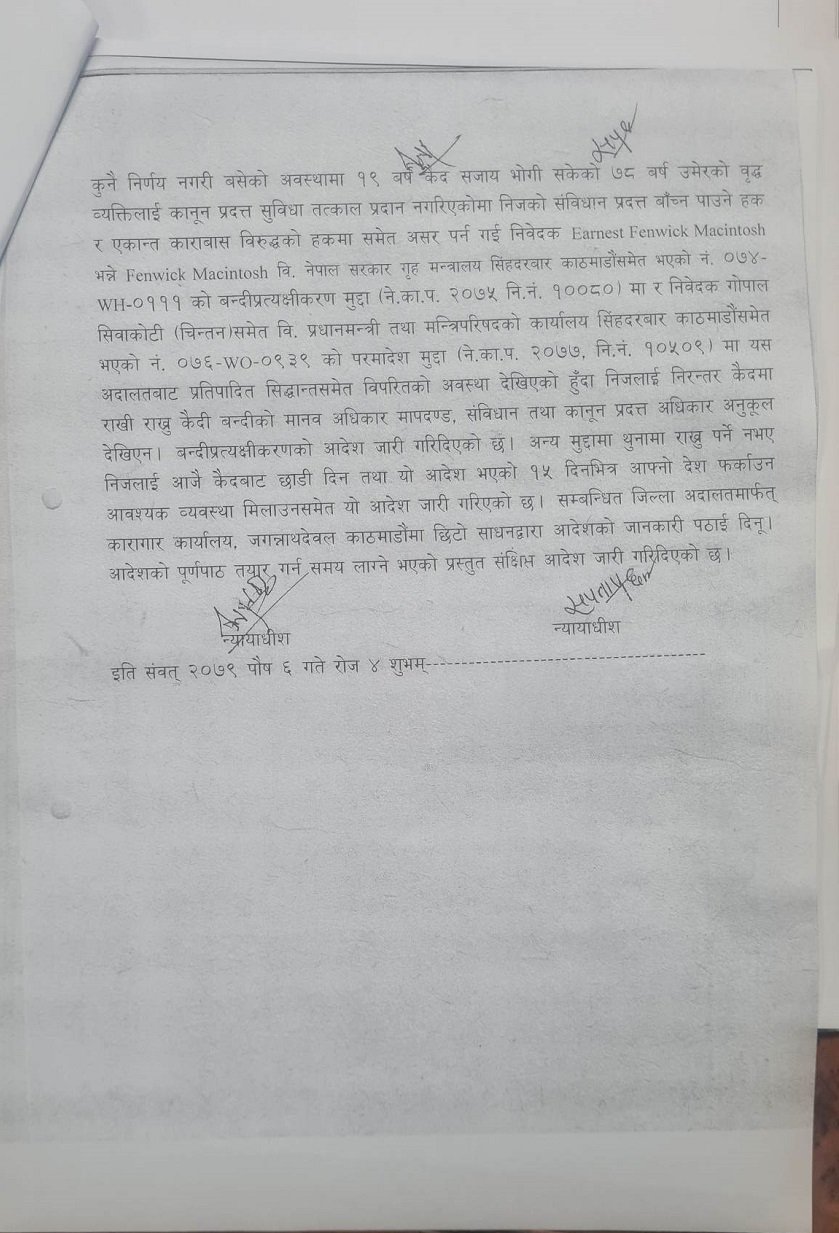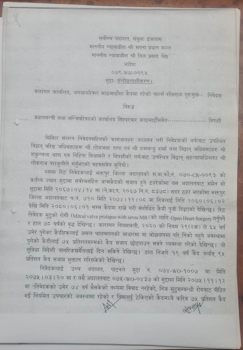 शोभराजका तर्फबाट दायर बन्दी प्रत्यक्षीकरणको निवेदनमा आदेश जारी गर्दै सर्वोच्चले निरन्तर कैदमा राखिराख्नु बन्दीको मानवाधिकार मापदण्ड, संविधान तथा कानुन प्रदत्त अधिकार अनुकूल नदेखिएको भनेको छ।