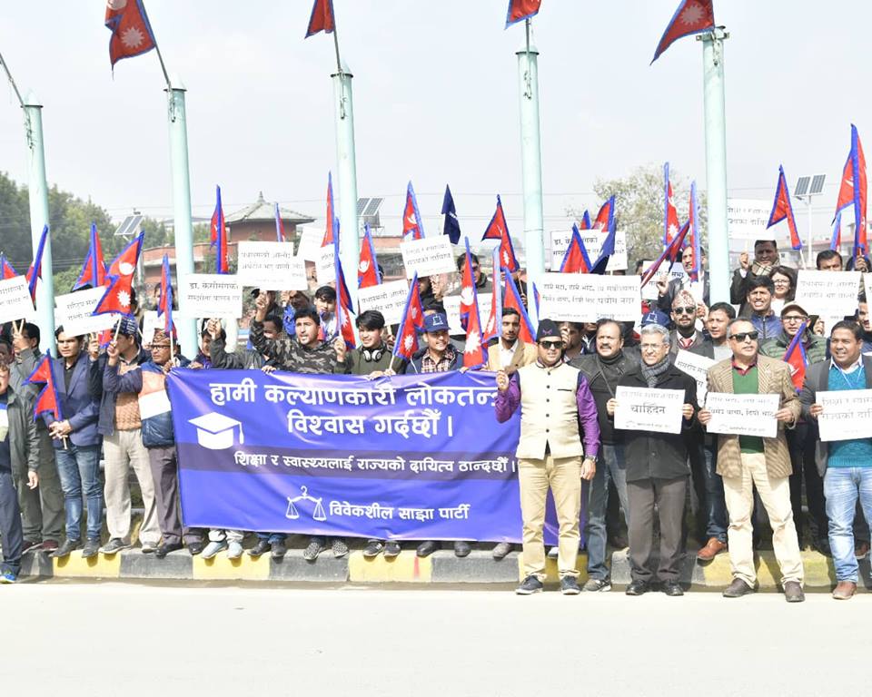 काठमाडौं – चिकित्सा शिक्षा विधेयकमा अनशनरत डा गोविन्द केसीका सबै माग नसमेटिएको भन्दै काठमाडौंको माइतिघर मण्डलामा विवेकशील साझा पार्टी र नेपाल विद्यार्थी संघले आइतबार छुट्छुट्टै प्रदर्शन गरेका छन्।