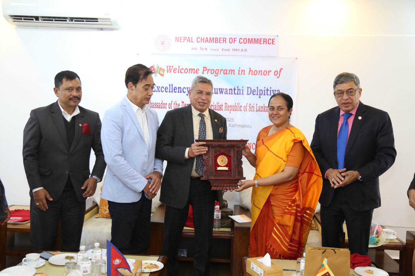 राजदूूत डेल्पितीयासँग चेम्बर अध्यक्ष कमलेश कुुमार अग्रवालले नेपाल श्रीलंकाबीचको व्यापारको आकार वार्षिक औसतमा मुुस्किलले २ दशमलव ५ मिलियन अमेरिकी डलर मात्रै रहेको र नेपालको निर्यात निकै कम रहेको बताए । नेपालले १ दशमलव ४० मिलियन अमेरिकी डलर बराबरको वस्तुु आयात गर्दा ० दशमलव ७० मिलियन डलरको मात्रै निर्यात गरिरहेको अध्यक्ष अग्रवालले बताए ।