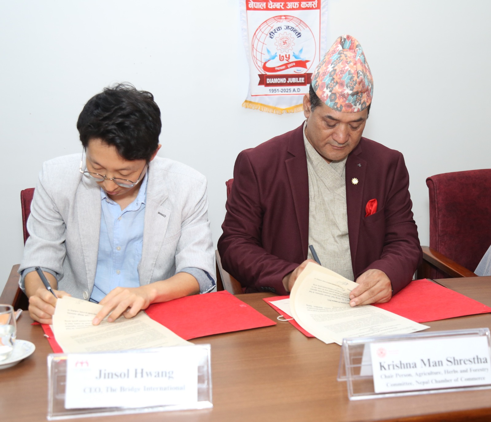 काठमाण्डुको जमलस्थित चेम्बर भवनमा मंगलबार आयोजित कार्यक्रममा कृषि, जडिबुटी तथा वन समितिका सभापति कृष्णमान श्रेष्ठ र ब्रिज इन्टरनेसनलका प्रमुख कार्यकारी अधिकृत जीनसोल वाङले सम्झौता पत्रमा हस्ताक्षर गरे ।