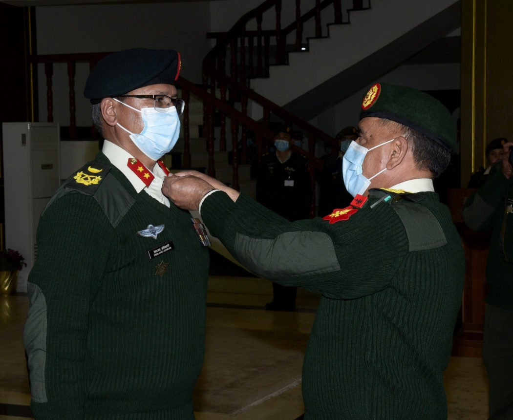 काठमाण्डु – प्रधानसेनापति प्रभुराम शर्माले उपरथी दर्जामा पदोन्नति भएका सहायक रथी प्रेमध्वज अधिकारीलाई दर्ज्यानी चिन्ह प्रदान गरेका छन् । प्रधानसेनापति शर्माले आइतबार जंगी अड्डामा आयोजित एक विशेष कार्यक्रमकाबीच अधिकारीलाई उपरथी दर्जाकाे दर्ज्यानी चिन्ह प्रदान गरेका हुन् ।