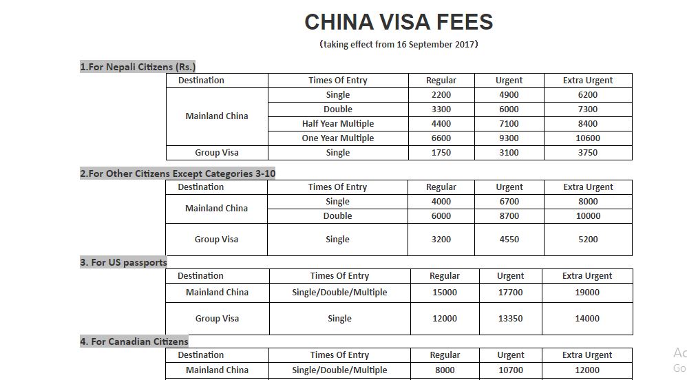 अब नेपालीले चीनको भिसाका लागि ६ हजार २ सय बुझाउनुपर्ने भएको छ । यसअघि २ हजार २ सय तिर्नुपर्ने थियो ।