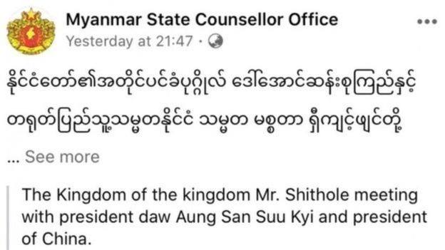 दुवैबीच भएको भेटवार्ता सम्बन्धी बर्मिज भाषाको फेसबुक पोस्टमा राष्ट्रपति सीको नाम अंग्रेजी अनुवादमा ‘शिथोले’ भएको थियो । सुकीको आधिकारिक फेसबुकबाट शेयर गरिएको पोस्टमा अंग्रेजी अनुवाद गलत भएको हो ।
