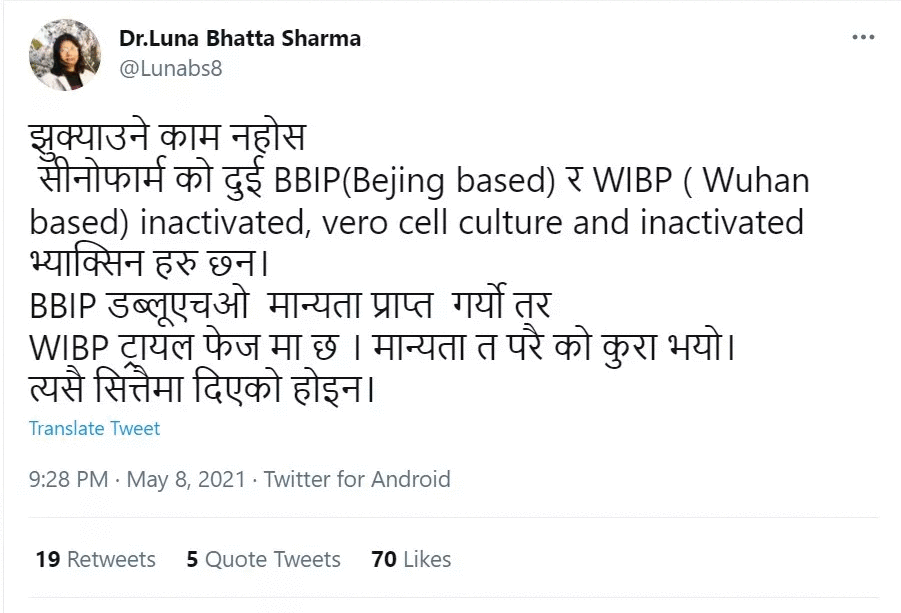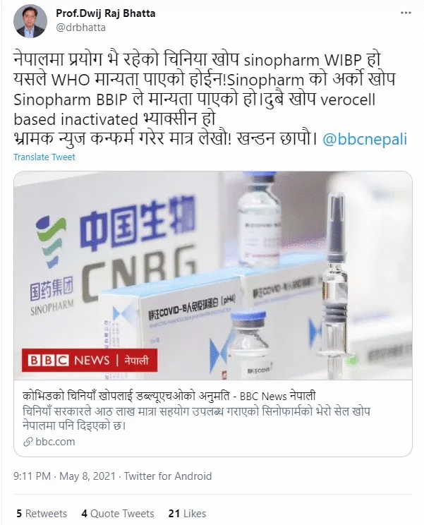 त्रिभुवन विश्वविद्यालयका माइक्रोबायोलोजीका प्रोफेसर द्विजराज भट्टले ट्वीटरमा बीबीसी नेपालीमा प्रकाशित समाचारको लिङ्कसहित शनिबार राति लेखेका छन्, ‘नेपालमा प्रयोग भइरहेको चिनियाँ खोप सिनोफार्म डब्लुआईबीपी हो । यसले डब्लुएचओ मान्यता पाएको होइन । सिनोफार्मको अर्को खोप बीबीआईपीले मान्यता पाएको हो । दुवै खोप भेरोसेल बेस्ड इनएक्टिभेटेड भ्याक्सिन हो ।’