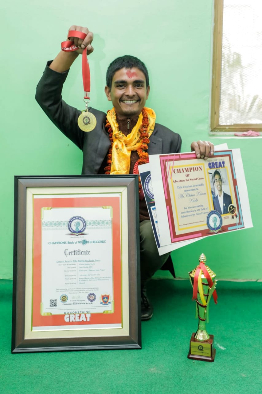उल्टो मोटरसाइकल हाँकेर पूर्वको मेची पुलबाट पश्चिमको महेन्द्रनगरको गड्डाचौकी पुग्न पाँच दिन लाग्यो । उनले विश्व शान्तिका लागी १ हजार १ सय ५३ किलोमिटर मोटरसाइकल यात्रा गरेर विश्व रेकर्ड कायम गरेरै छाडे ।