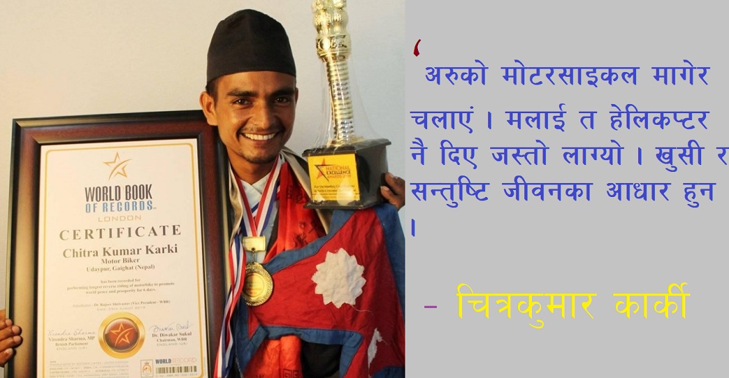 प्रसंग ९ वर्ष अघिको हो, चित्रकुमार कार्कीले उल्टो मोटरसाइकल चलाएर विश्व किर्तीमानी राखे जबरजस्त रुपमा । सूरुमा त कसैले उनलाई पत्याएकै थिएनन् । उल्टो मोटरसाइकल चलाउंछु भन्दा धेरैले उनलाई मुर्ख, पागल भने । कतिले लडेर मर्छ समेत भने । जिल्ला प्रशासन कार्यालयले त यस्तो काम गर्न अनुमति दिएकै थिएन । कार्की काठमाण्डु आएर आफैंले गृह मन्त्रालय र पर्यटन तथा नागरिक उड्डयन मन्त्रालयबाट अनुमति लिए । फेरी पुगे उदयपुरको सदरमुकाम गाईघाट ।