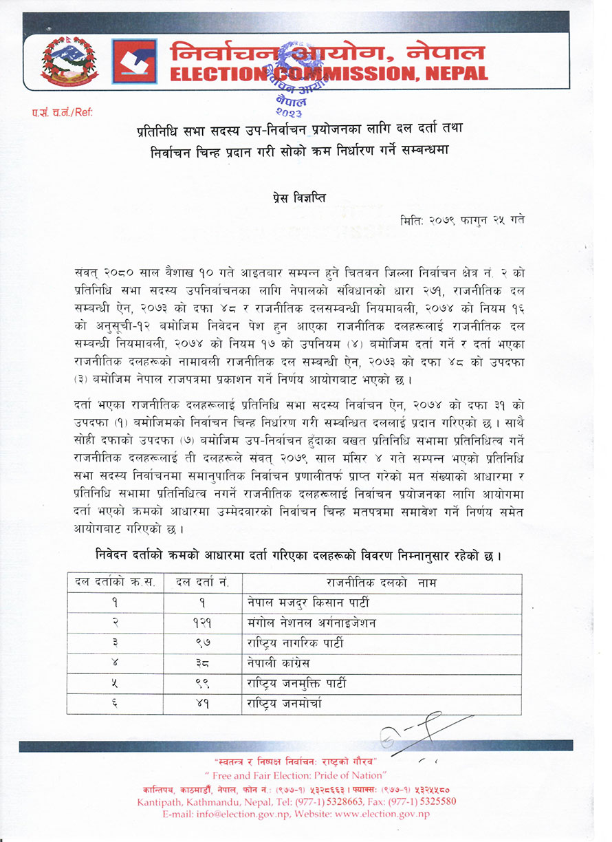 सोही दफाको उपदफा (७) बमोजिम उपनिर्वाचन हुँदाका बखत प्रतिनिधिसभामा प्रतिनिधित्व गर्ने राजनीतिक दललाई ती दलले २०७९ मङ्सिर ४ गते सम्पन्न भएको प्रतिनिधिसभा सदस्य निर्वाचनमा समानुपातिक निर्वाचन प्रणालीतर्फ प्राप्त गरेको मत सङ्ख्याका आधारमा र प्रतिनिधिसभामा प्रतिनिधित्व नगर्ने राजनीतिक दललाई निर्वाचन प्रयोजनका लागि आयोगमा दर्ता भएको क्रमका आधारमा उम्मेदवारको निर्वाचन चिन्ह मतपत्रमा समावेश गर्ने निर्णय भएको आयोगका प्रवक्ता शालिग्राम शर्मा पौड्यालले आज विज्ञप्ति जारी गरी जानकारी दिए।