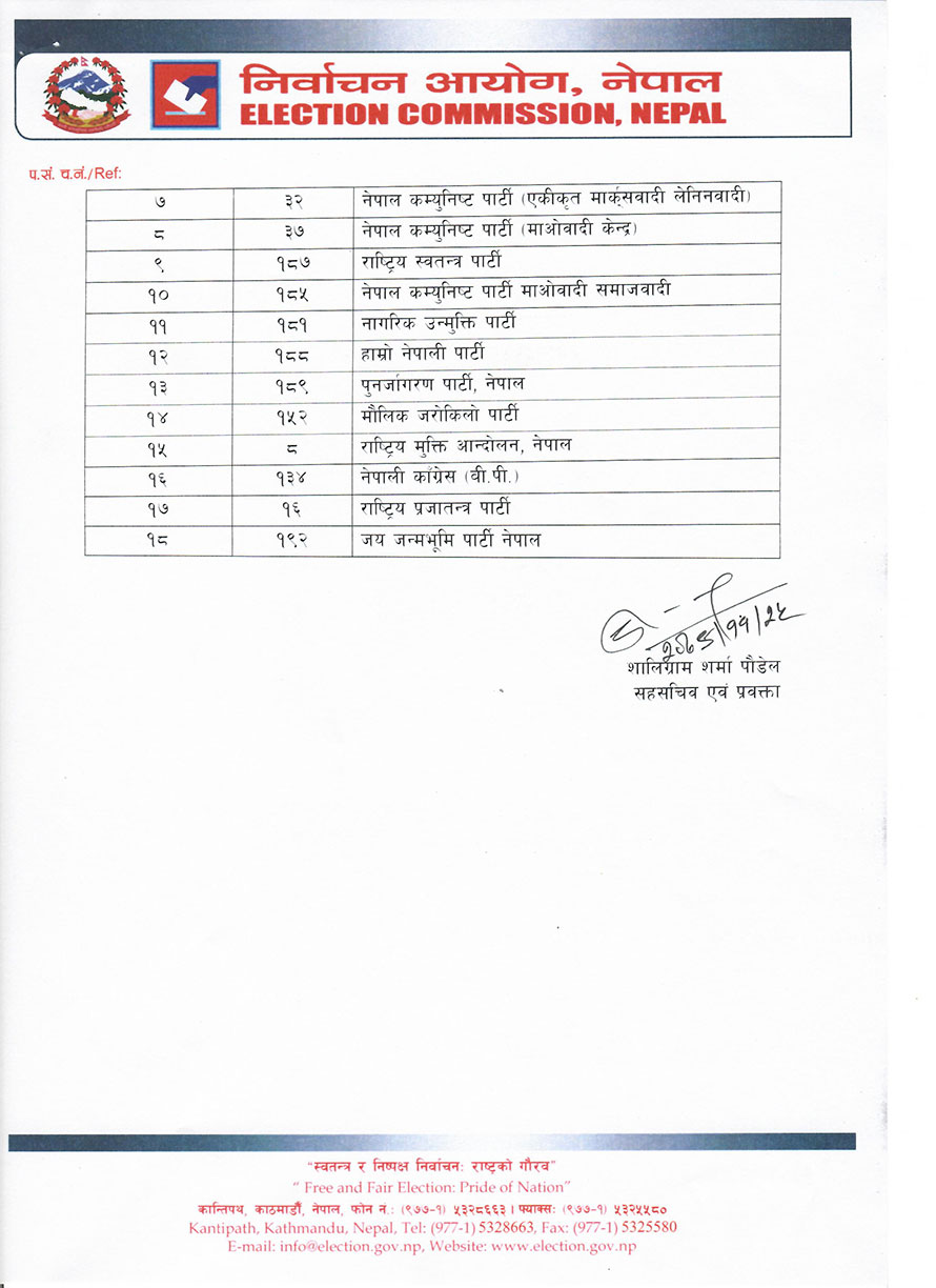 दर्ता भएका राजनीतिक दललाई प्रतिनिधिसभा सदस्य निर्वाचन ऐन, २०७४ को दफा ३१ को उपदफा (१) बमोजिमको निर्वाचन चिन्ह निर्धारण गरी सम्बन्धित दललाई प्रदान गरिएको हो।