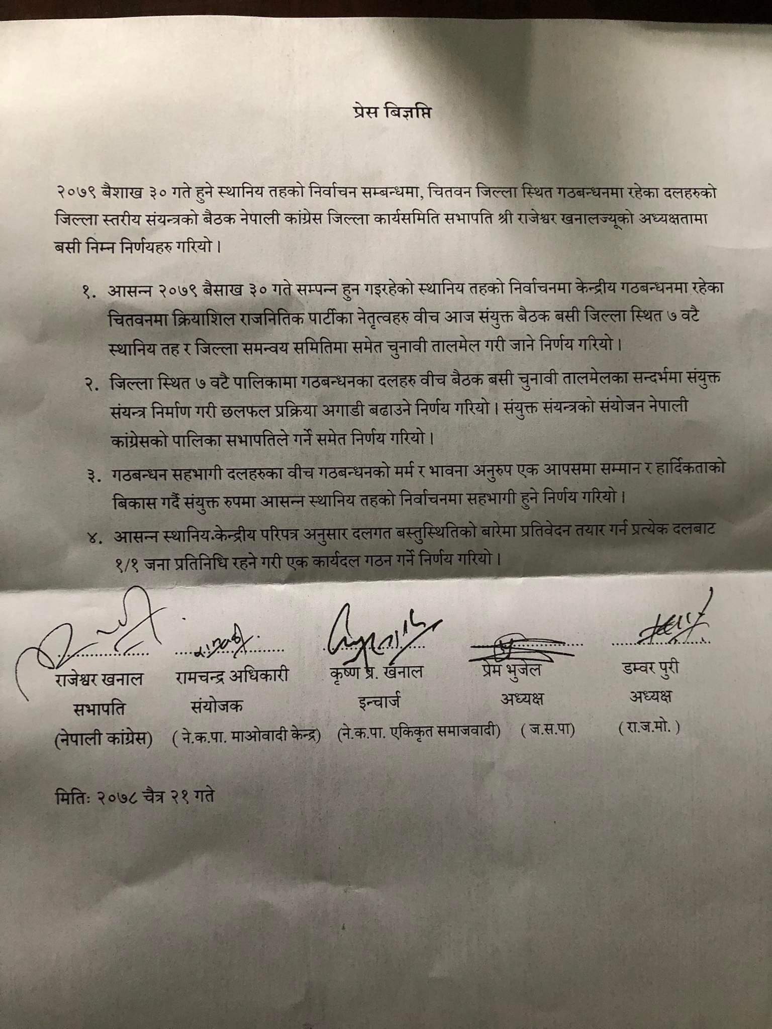 त्यस्तै बैठकले ४ बुँदे निर्णय समेत गरेको छ । जिल्लाका सबै पालिकामा गठबन्धनका दलहरूबीच चुनावी तालमेलका लागि नेपाली कांग्रेसको सम्बन्धित पालिका सभापतिको नेतृत्वमा संयन्त्र बनाउने निर्णय गरेको छ ।