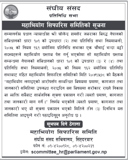 समितिले शुक्रबार सार्वजनिक सूचना प्रकाशित गरेर महाअभियोग लगाइएको आरोपसँग सम्बन्धित विषयमा प्रमाण, कागजात तथा जानकारी तीन दिनभित्र उपलब्ध गराइदिन सम्बन्धित व्यक्ति तथा निकायसँग आग्रह गरेको हो ।
