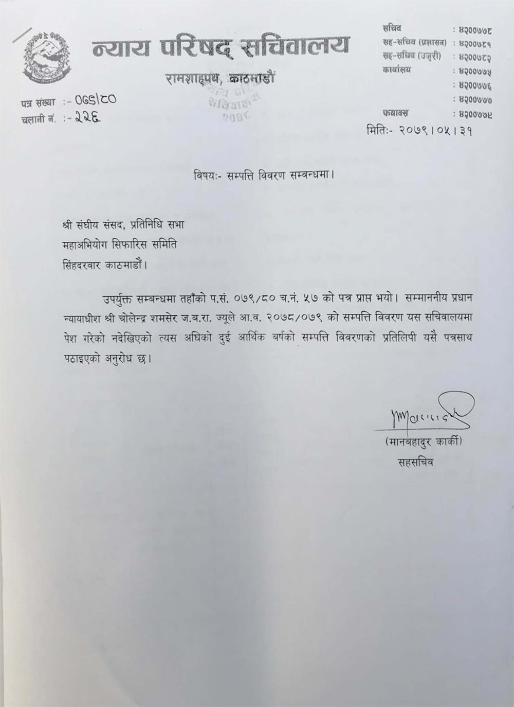 काठमाण्डु – निलम्बित प्रधानन्यायाधीश चोलेन्द्र शमशेर जबराको सम्पत्ति विवरण न्याय परिषद्ले संसद्को महाभियोग सिफारिस समितिलाई बुझाएको छ।