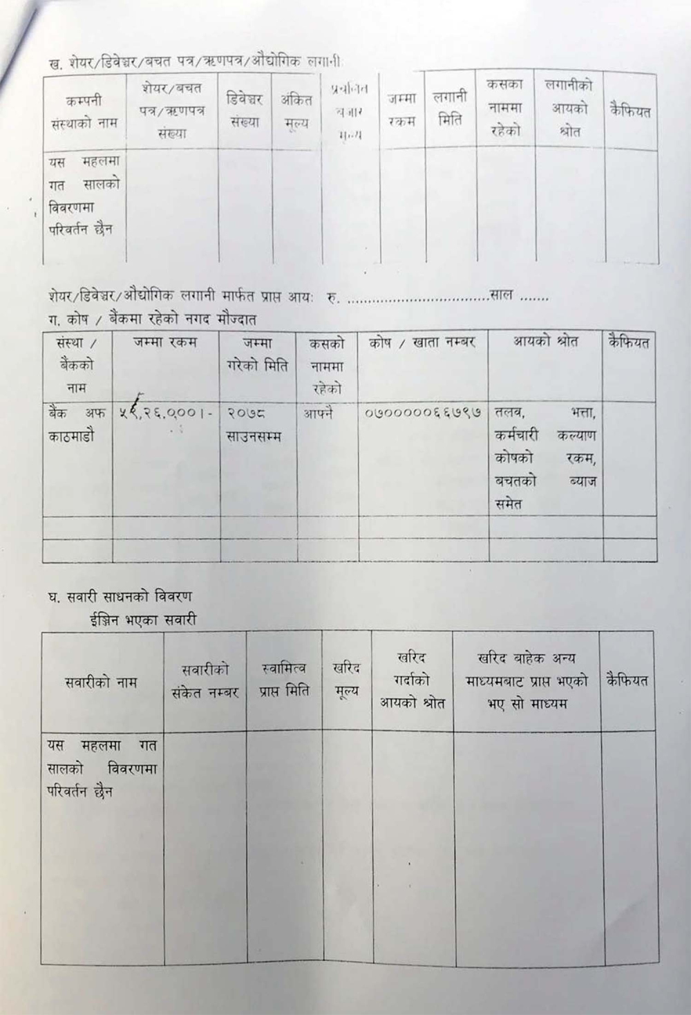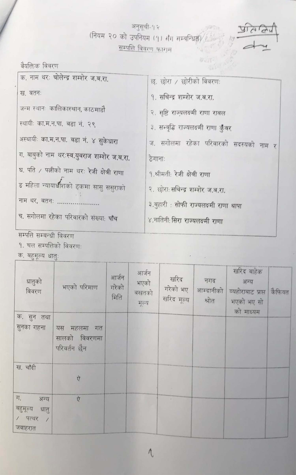 ठमेलको घरजग्गा धितोमा राखी ९ करोड ५० लाख ऋण लिएको विवरणमा उल्लेख छ । त्यस्तै सम्पत्ति विवरणमा पुरानै विवरण उल्लेख भएको जनाइएको छ । साथै गरगहना पनि विवरणमा उल्लेख गरिएको छैन । श्रीमती रेजी क्षेत्री राणाको नाममा काठमाडौं–५ मा १ रोपनी ८ आना ३ पैसा १ दाम जमिन रहेको छ ।