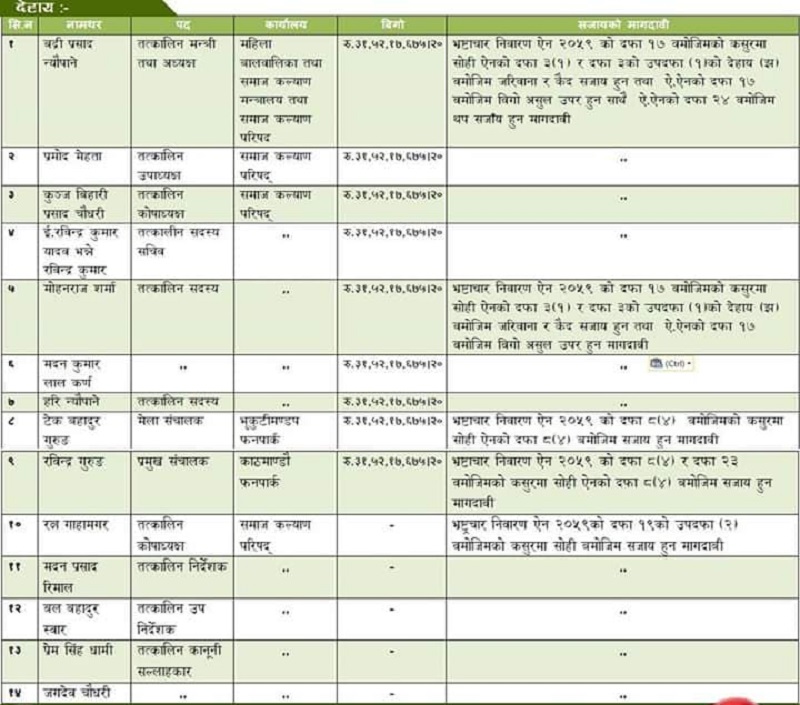 अख्तियारले तत्कालिन महिला, बालवालिका तथा समाज कल्याण मन्त्री एवं समाज कल्याण परिषद्का तत्कालिन अध्यक्ष बद्रीप्रसाद न्यौपाने र पूर्व श्रम तथा रोजगारमन्त्री टेकबहादुर गुरूङ समेत १४ जनाले ३१ करोड ५२ लाख हिनामिना गरेको दाबी गर्दै असुल हुनुपर्ने मागसहित मुद्दा दायर गरेको हो।