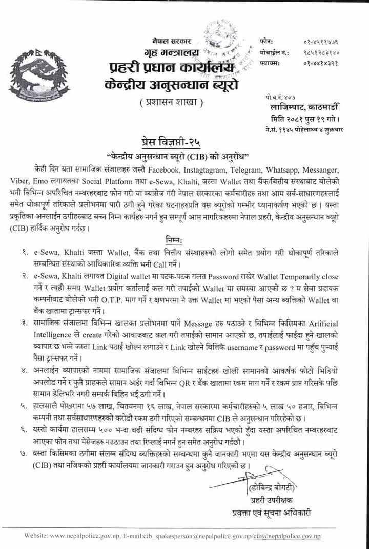सीआईबीले पछिल्लो समय विभिन्न सामाजिक सञ्जाल फेसबूक, इन्टाग्राम, टेलिग्राम, ह्वाट्सएप, मेसेन्जर, भाइबर, इमो लगायत प्लेटफर्मबाट बोलेको भन्दै अपरिचित नम्बरबाट मेसेज वा कल गरी ठगी गर्ने कार्य बढेकाले सर्वसाधारणलाई सचेत गराएको छ ।