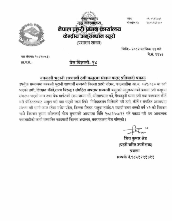 काठमाण्डु – नक्कली भुटानी शरणार्थी प्रकरणमा संलग्न रही लामो समयदेखि फरार रहेका १ प्रतिवादीलाई केन्द्रीय अनुसन्धान ब्यूरो (सीआईबी)ले पक्राउ गरेको छ ।