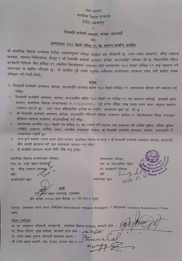 वाग्मती प्रदेशको सामाजिक विकास मन्त्रालय र अस्पतालबीच भएको सम्झौता अनुसार अस्पतालमा कोभिडका बिरामीहरुलाई उपचार गराउनको लागि दुई करोड २४ लाख ५० हजार रुपैयाँ अनुदान सहयोग गर्ने भएको छ ।