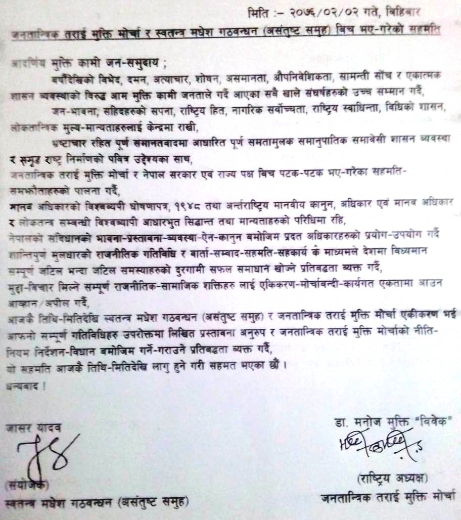 गठबन्धनका असन्तुष्ट समूहको नेतृत्व गरेका जासर यादव र जनतान्त्रिक तराई मुक्ति मोर्चाका अध्यक्ष डा. मुक्तिले बिहीबार एक संयुक्त विज्ञप्ति जारी गर्दै एकता भएको घोषणा गरेका हुन् । उनीहरुले जेठ २० गते निर्वाचन आयोगमा नयाँ पार्टी दर्ता गर्ने जनाएका छन् ।