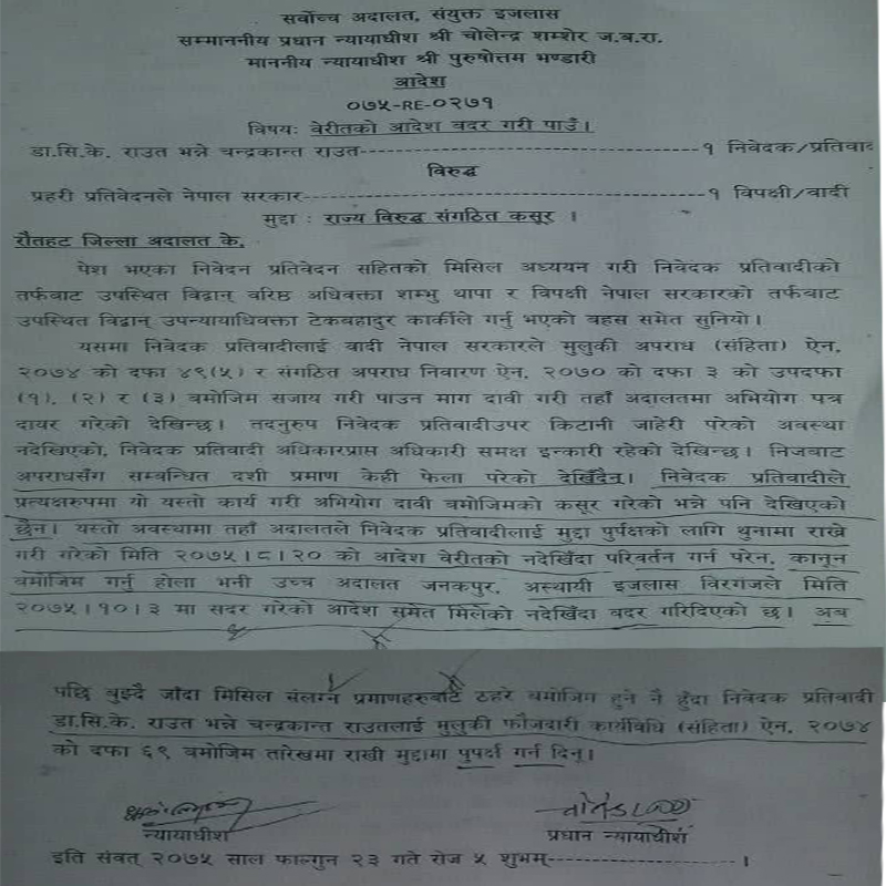 प्रधानन्यायाधीश चोलेन्द्रशमशेर राणा र पुरुषोत्तम भण्डारीको इजलासले राउतलाई छाड्न आदेश दिएको हो।राउतलाई जिल्ला अदालत रौतहटले पूर्पक्षका लागि थुनामा पठाएको थियो।