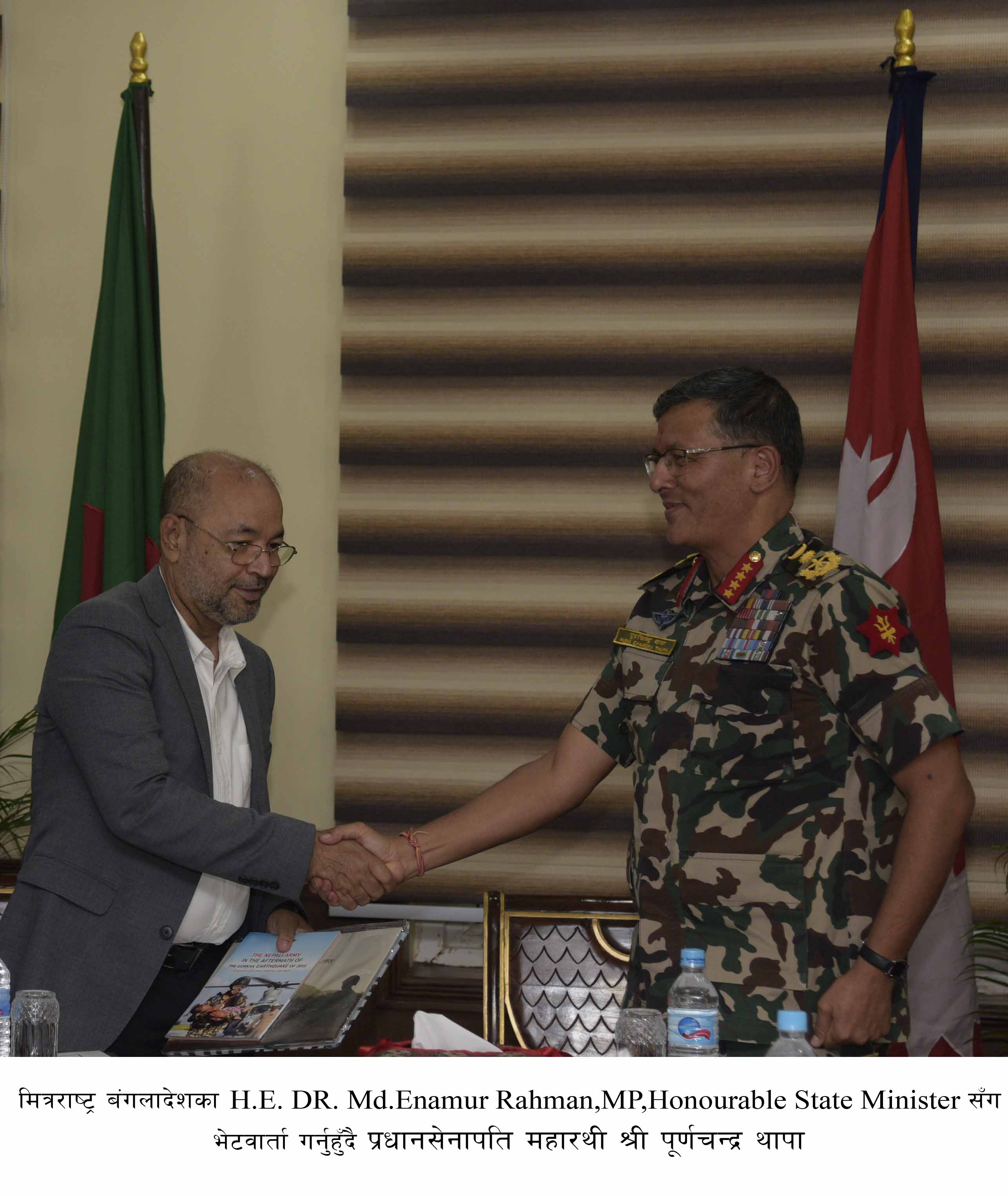 काठमाडौं – प्रधानसेनापति पूर्णचन्द्र थापा र बंगलादेशका राज्यमन्त्री इनामुर रहमानबीच भेटवार्ता भएको छ ।